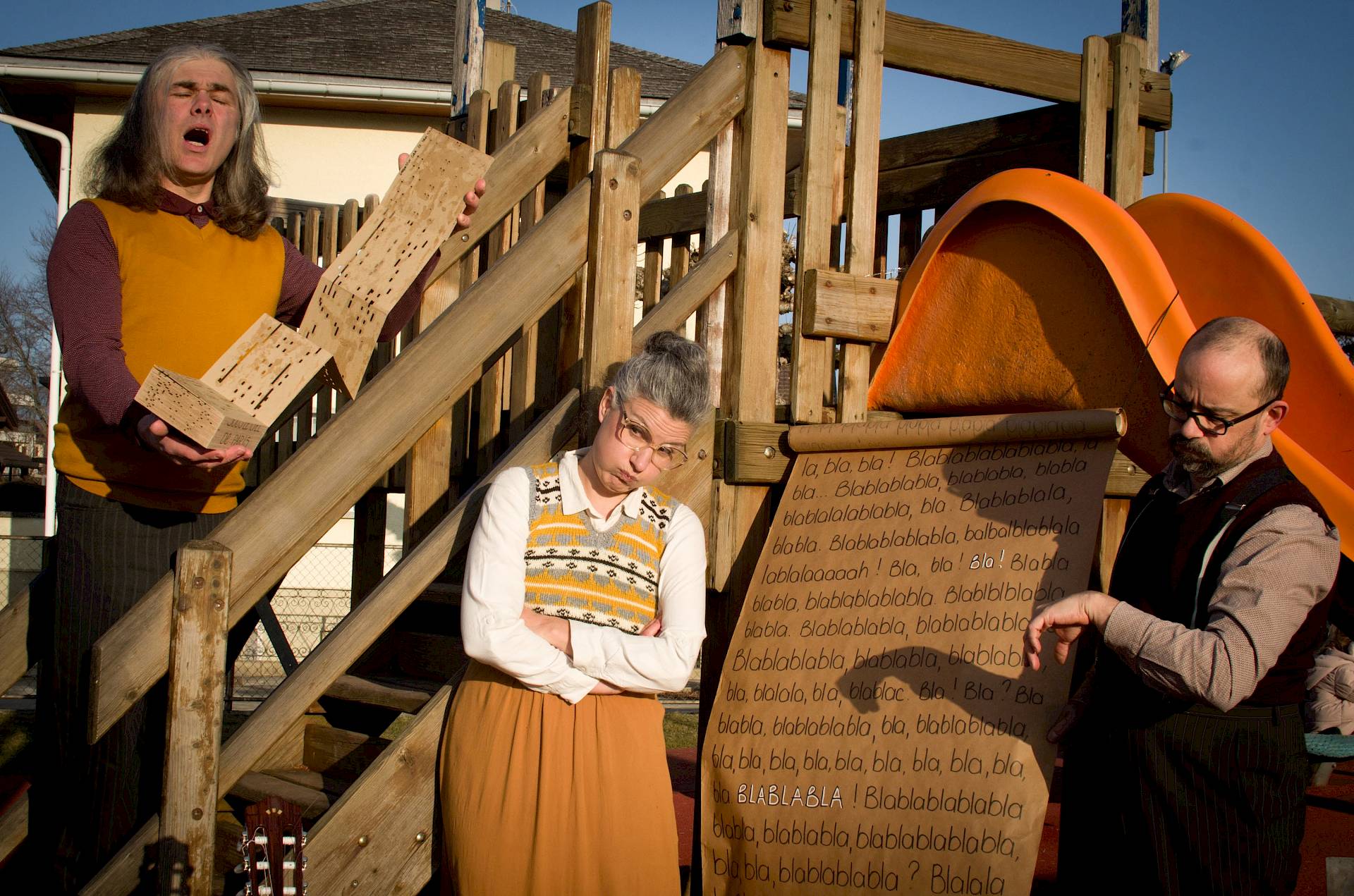 Trois artistes, un peu comédiens et beaucoup musiciens. Ou l’inverse. Grégoire Quartier à la batterie et aux ciseaux, Niko Chauvancy à la guitare et à la scie et Magali Pasquier à l’accordéon et au minuteur.