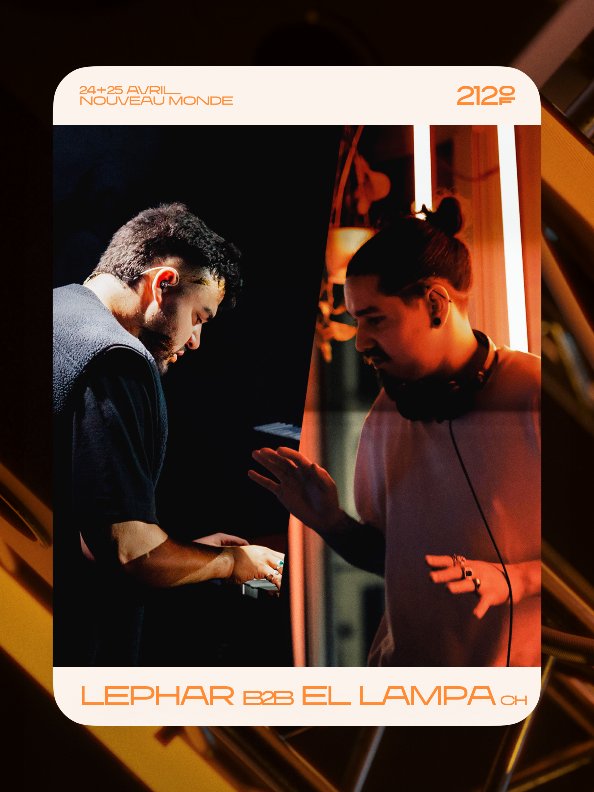LaPhar et El Lampa ouvrent le festival avec un set en duo. Les deux membres du collectif 212°F, qui collaborent depuis un certain temps à la production et à la création d'un spectacle live, forment un duo explosif aux platines pour ce DJ set.