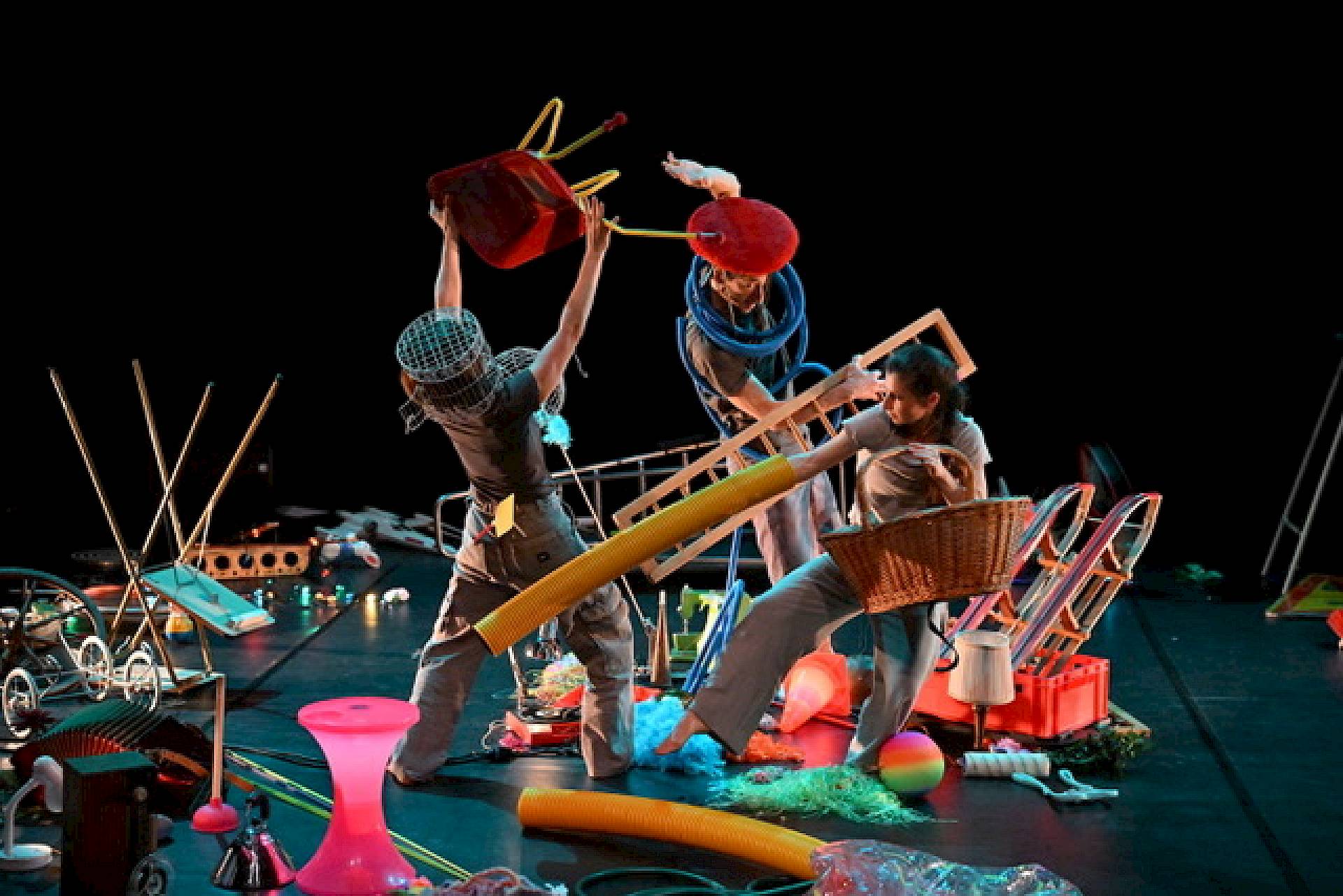 Drei seltsame Figuren entdecken unbekannte Gegenstände – ohne vorgefasste Idee von deren Nutzen oder Wert. Bald erwachen einige wie von Zauberhand zum Leben. Die Darsteller:innen machen sich ihre Eigenschaften zu eigen und lassen ein Quartett aus Teekannen-Tänzerinnen, ein verzaubertes Rohr oder Vogelkäfig-Frauen entstehen und formen eine Welt, in der alle ihren Platz finden.